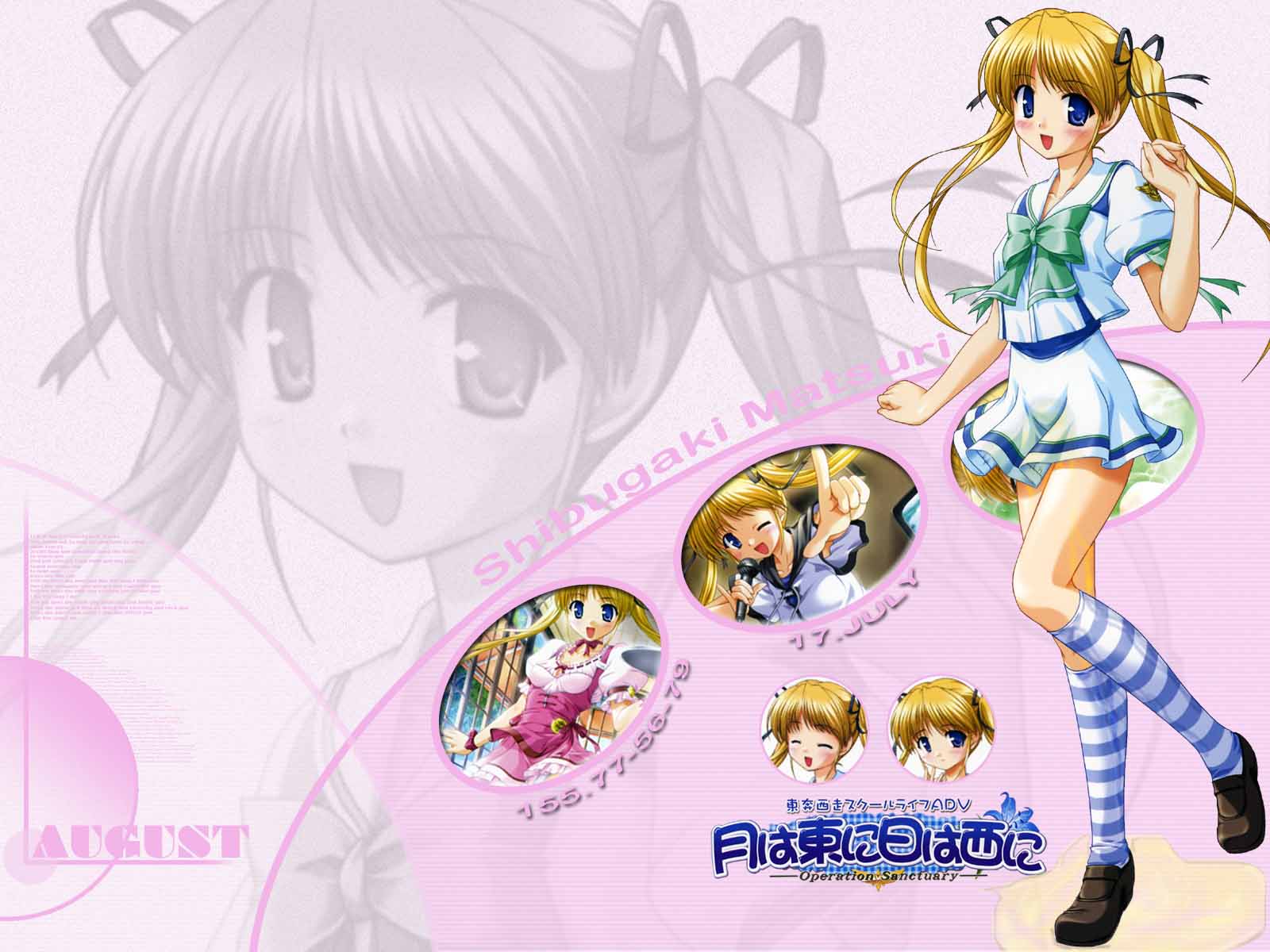 この画像の月は東に日は西にの壁紙シリーズで藤枝保奈美 渋垣茉理 橘ちひろ 秋山文雄 天ヶ崎美琴の1600×1200だと思いますけどこの壁紙シリーズで夏制服の全身立ち絵の壁紙を探しています持っている人ありましたらよろしくお願いします